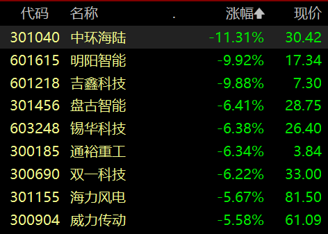 风电设备板块走低,中环海陆跌超11% ,明阳智能 、吉鑫科技跌超9% 。