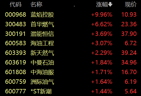 具体来看,油气板块震荡拉升,蓝焰控股涨停 ,首华燃气涨超6% ,潜能恒信、海油工程、新天然气等股跟涨。